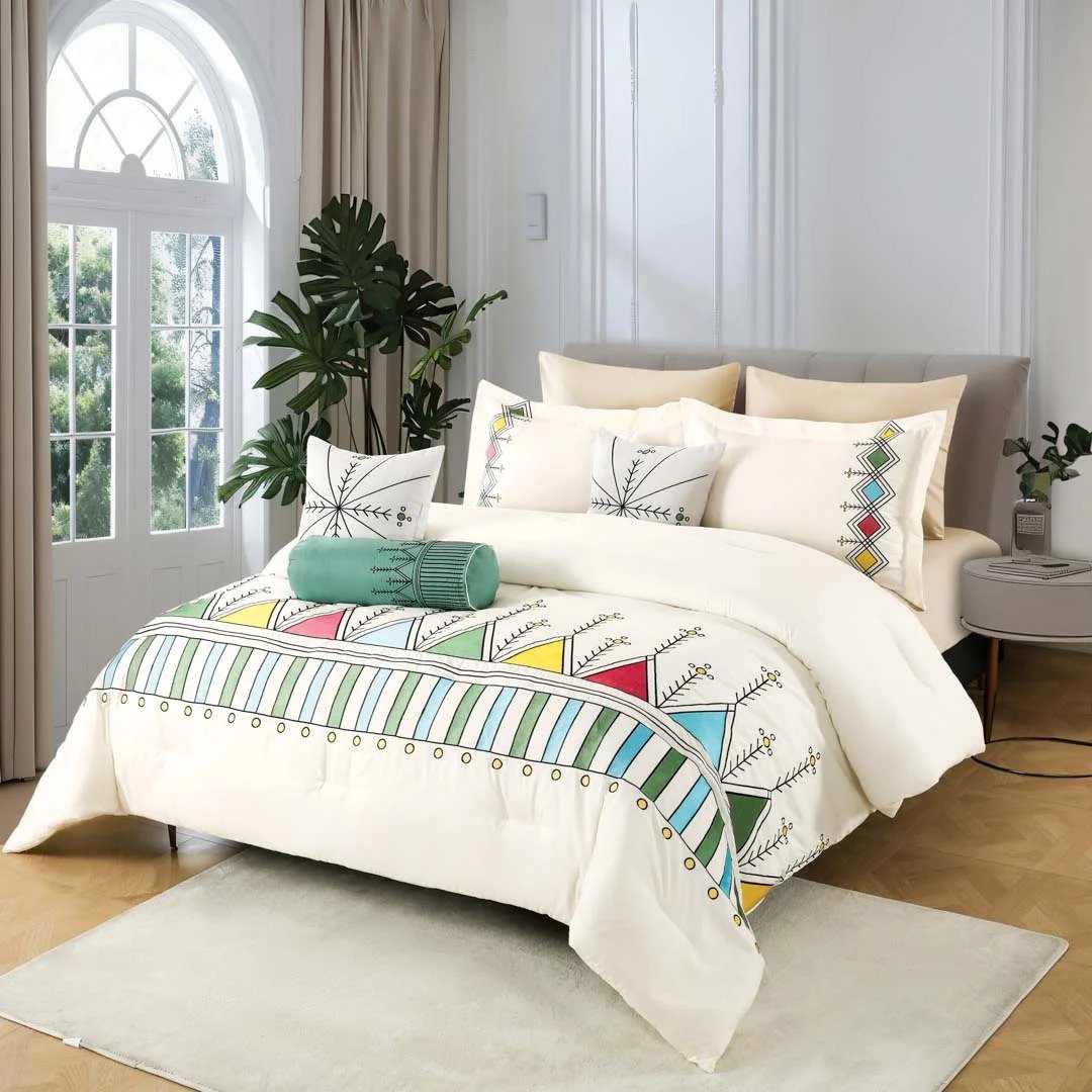 مفرش صيفي مستوحى من زخارف منطقة عسير الغنية بالتفاصيل الفنية الراقية، يأتي بلون كريمي هادئ وخامة خفيفة باردة، تمنحك الراحة المطلوبة في فصل الصيف.