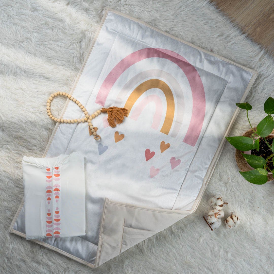 سجادة صلاة متعددة الالوان برسومات قوس قزح الجميلة، صُنعت من خامة المخمل لراحة أكثر للقدمين و الركبتين.