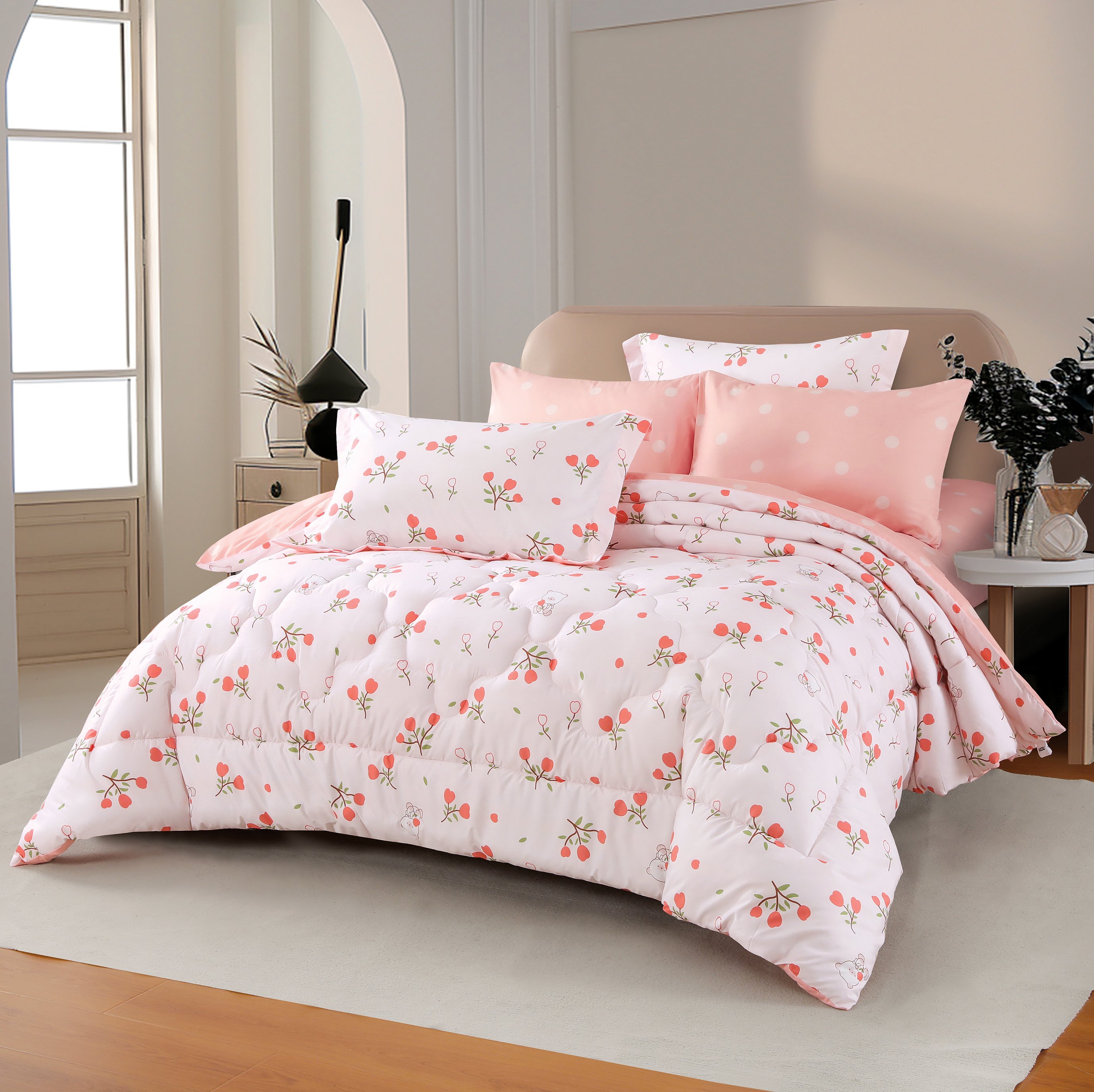 امنح غرفة نومك لمسة من الفخامة مع مفرش ديزاير الصيفي المطبوع بتصميم أنيق وعصري يضفي على المكان إحساسًا بالانتعاش والرقي. مصنوع من أفضل أنواع المفارش بخامة المايكروفايبر العالية الجودة، التي تجمع بين النعومة الفائقة والخفة المثالية لفصل الصيف.