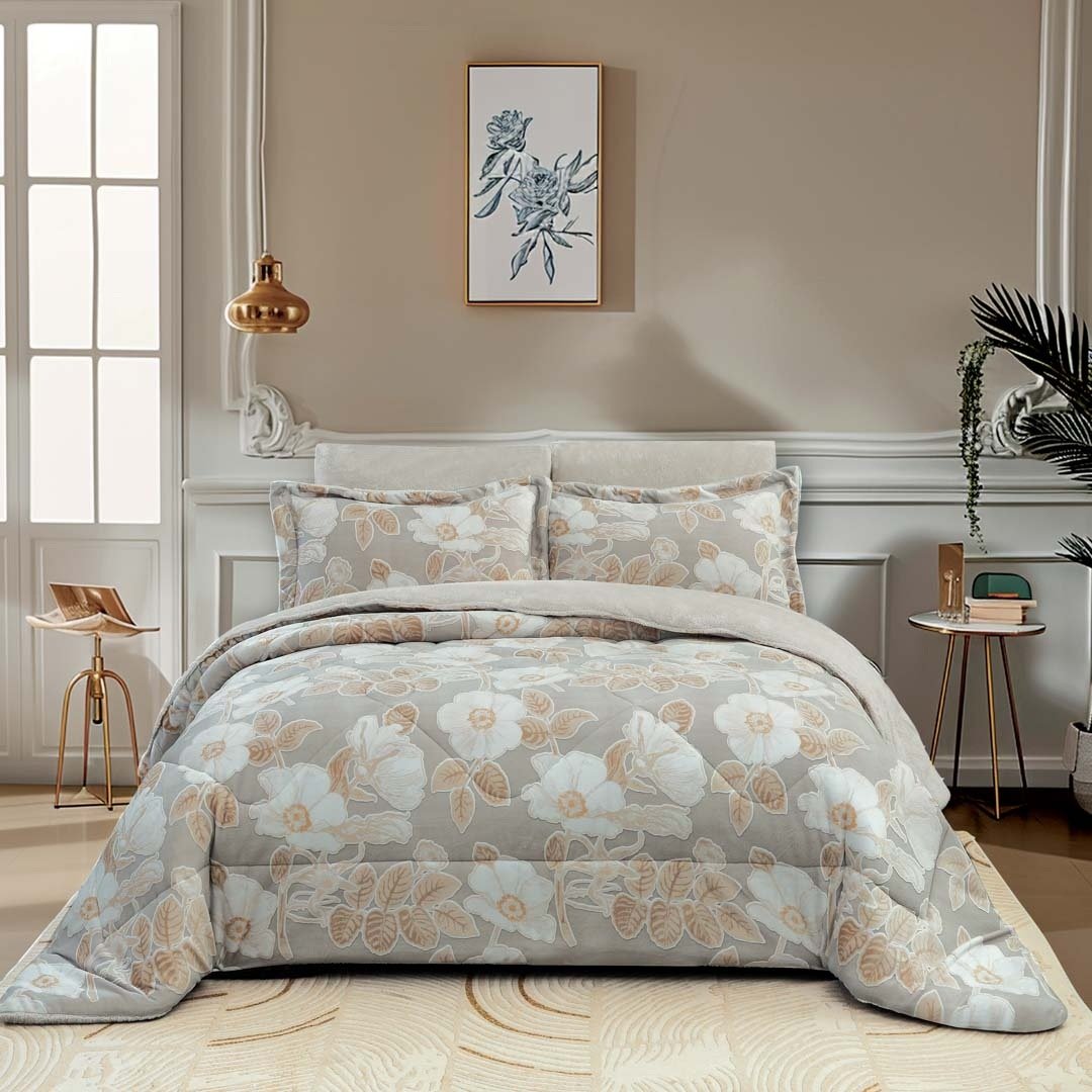 مفرش منال شتوي كوين فرو بيج ورصاصي برسومات الزهور عدد القطع 4