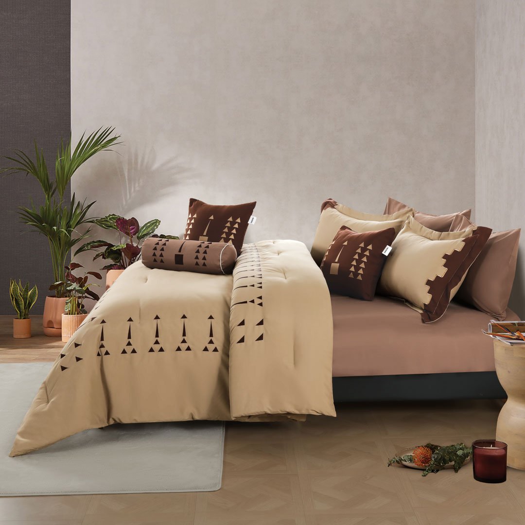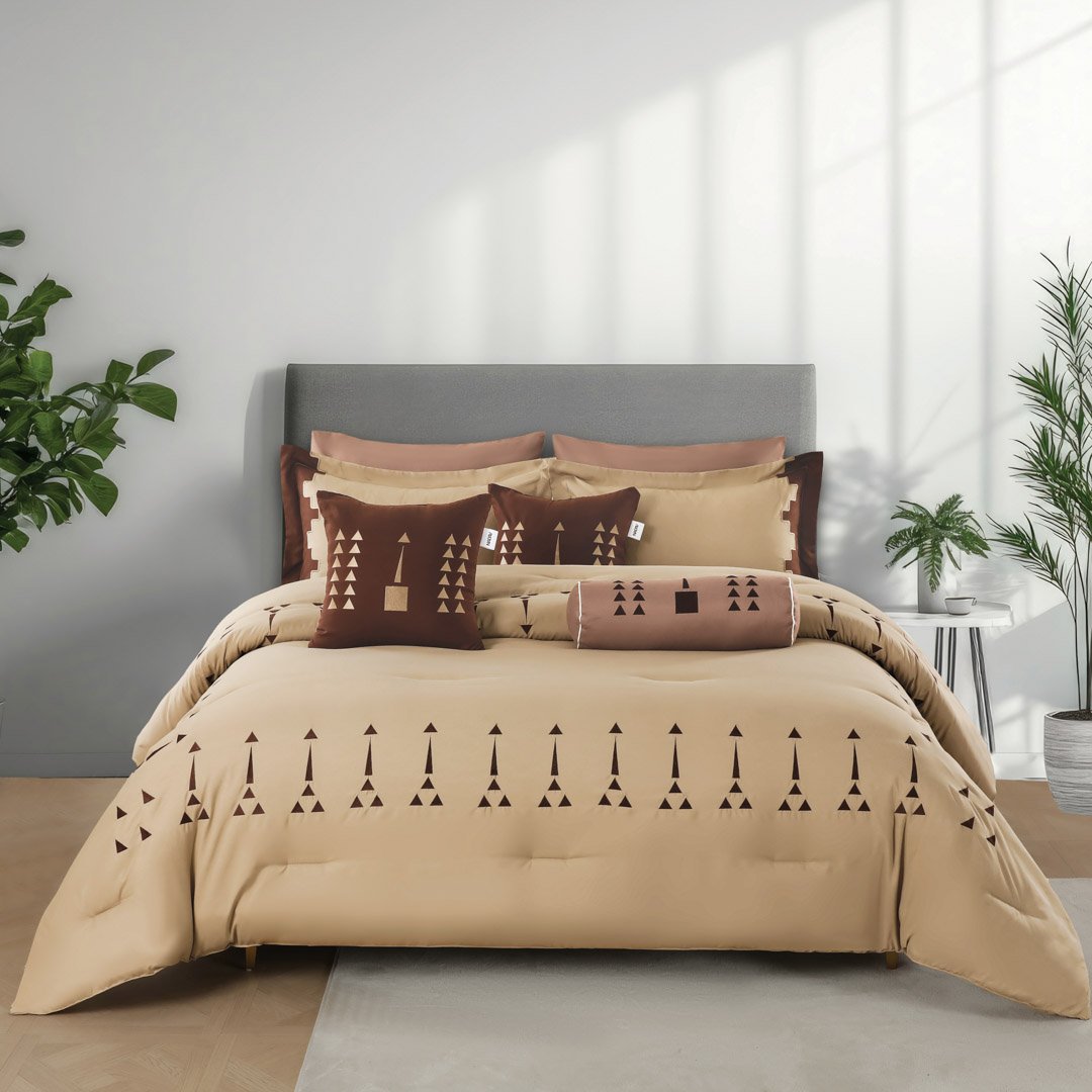 Diriyah summer double bedspread brown embroidered 9Pcs from Al Habib Bedspreads features a design inspired by the ancient Najdi style , featuring harmonious geometric motifs and warm colors, a clear expression of the depth of Saudi identity.